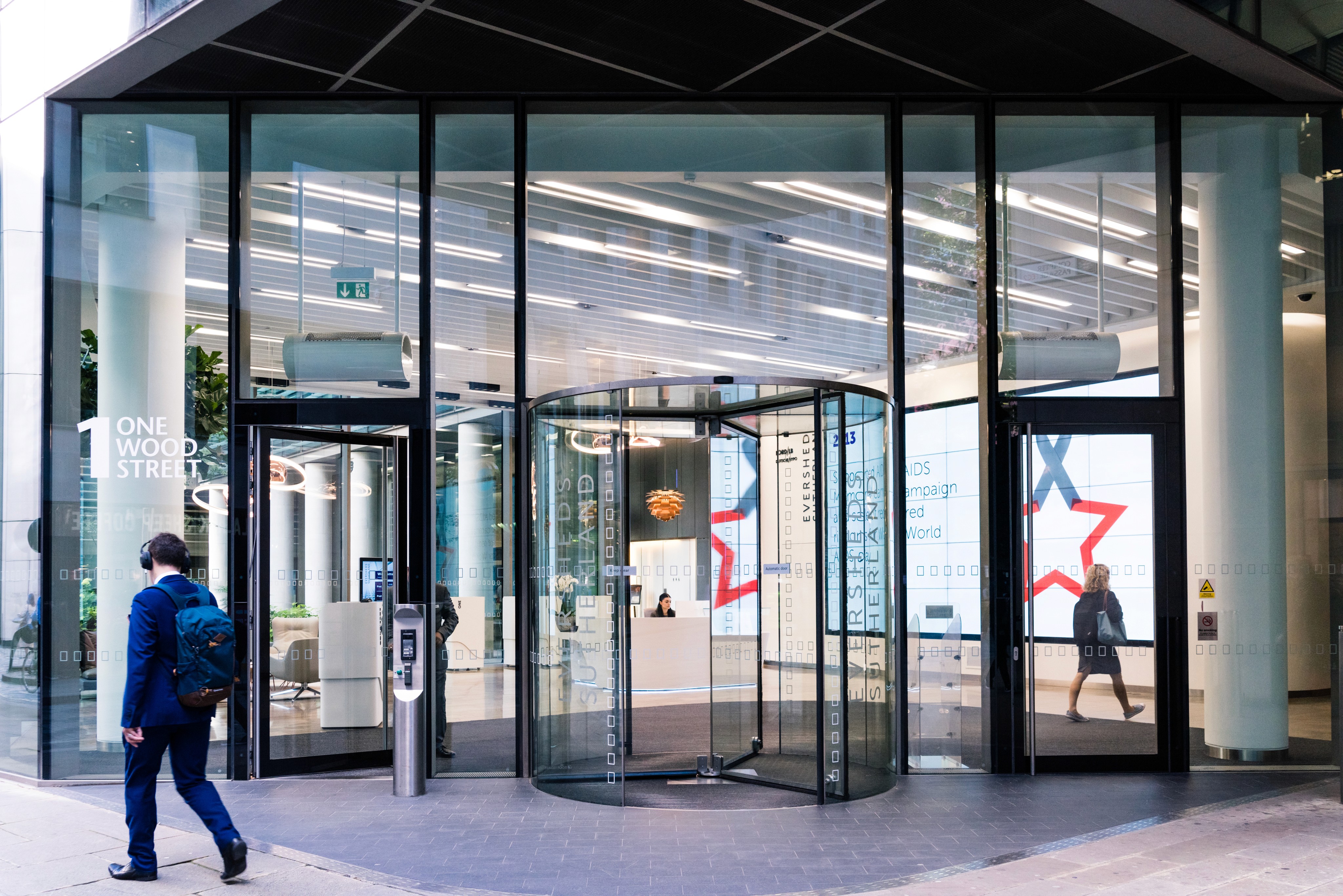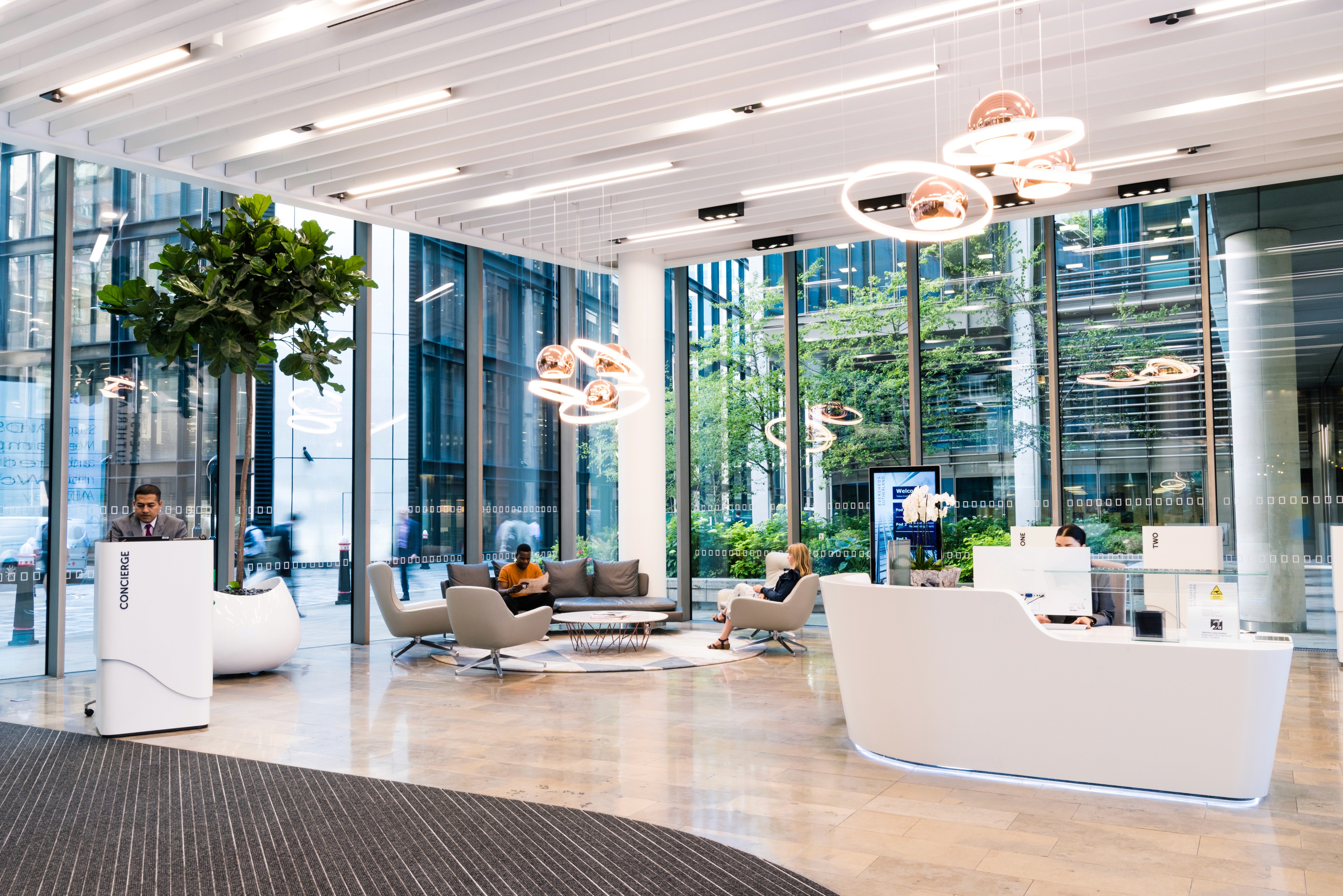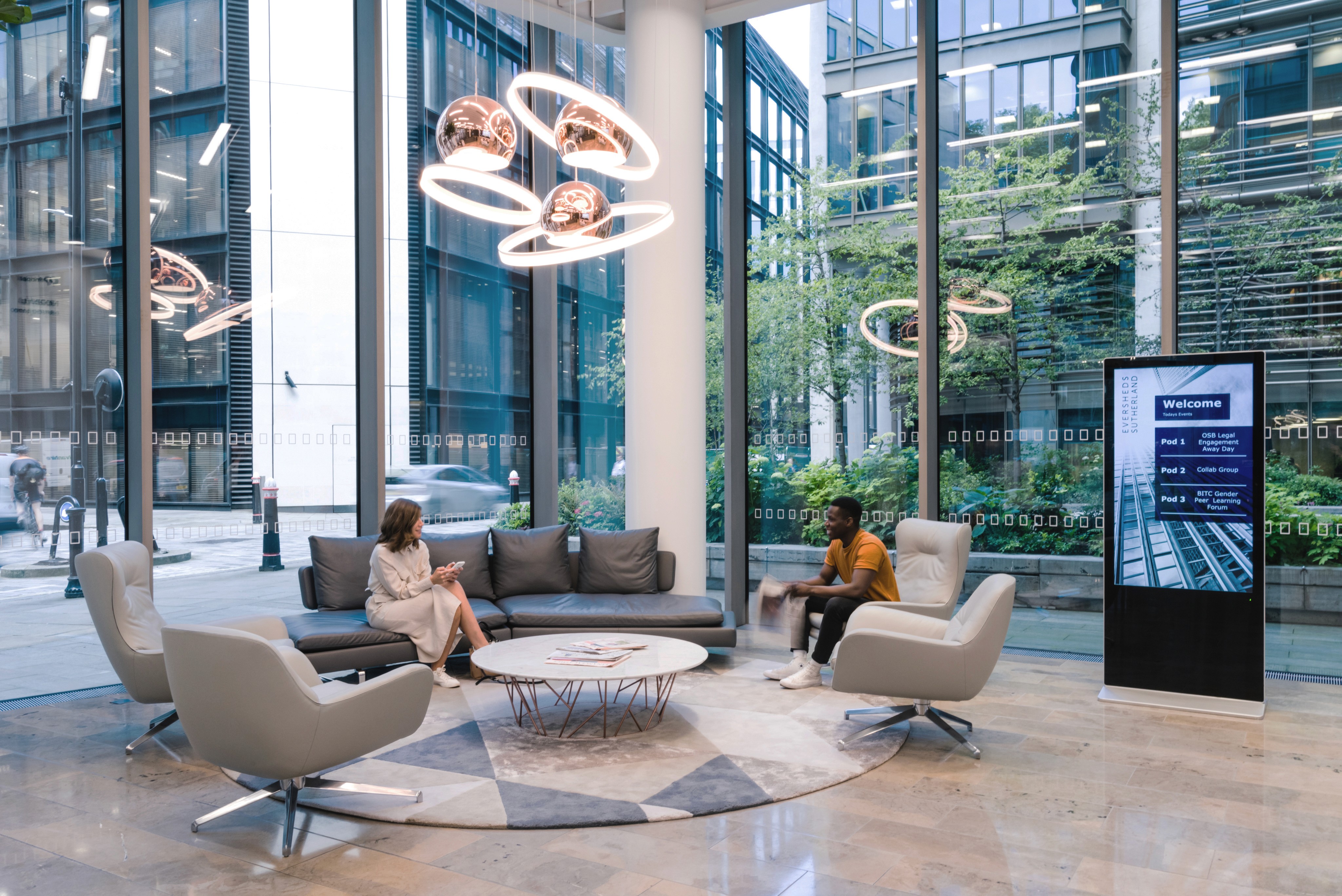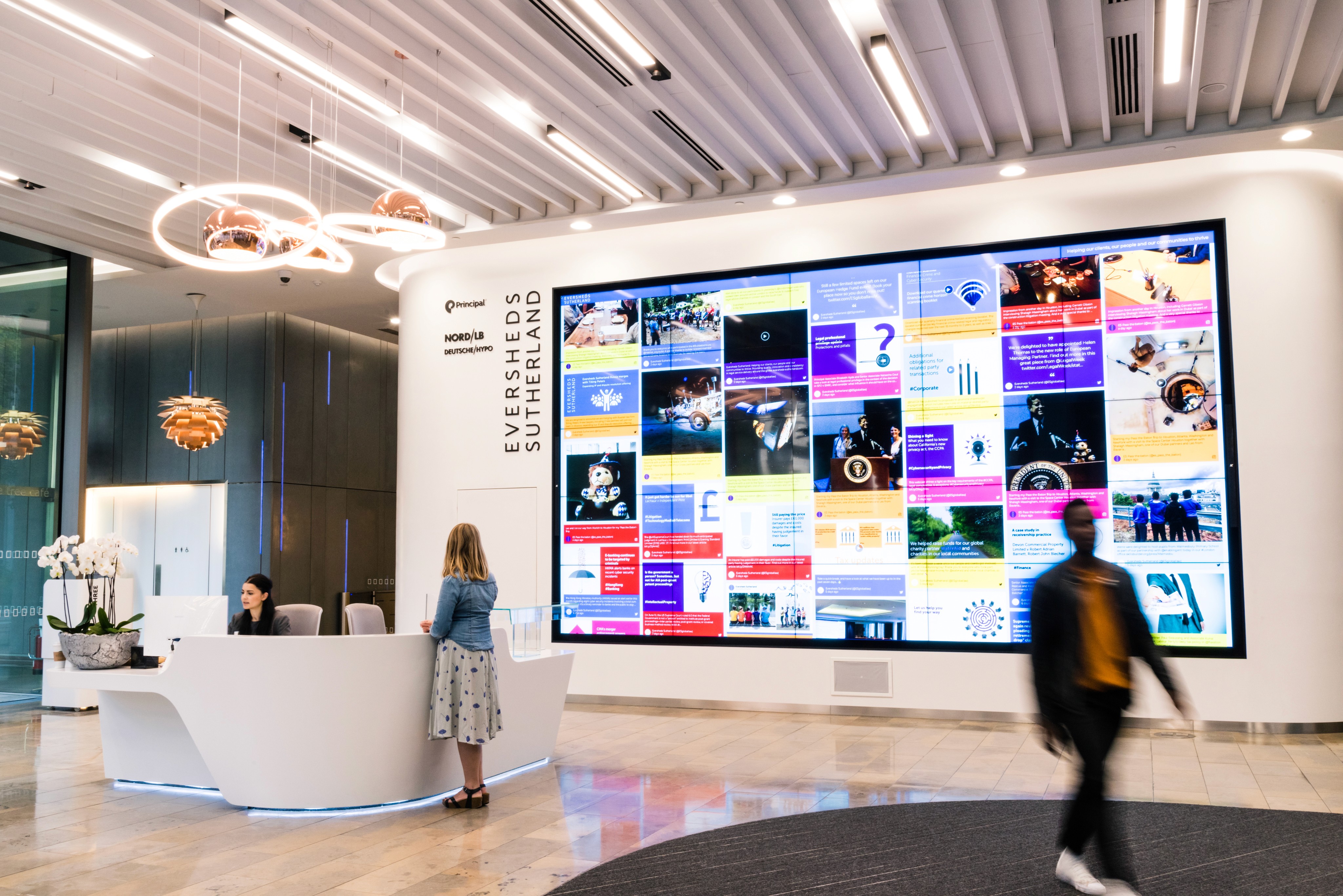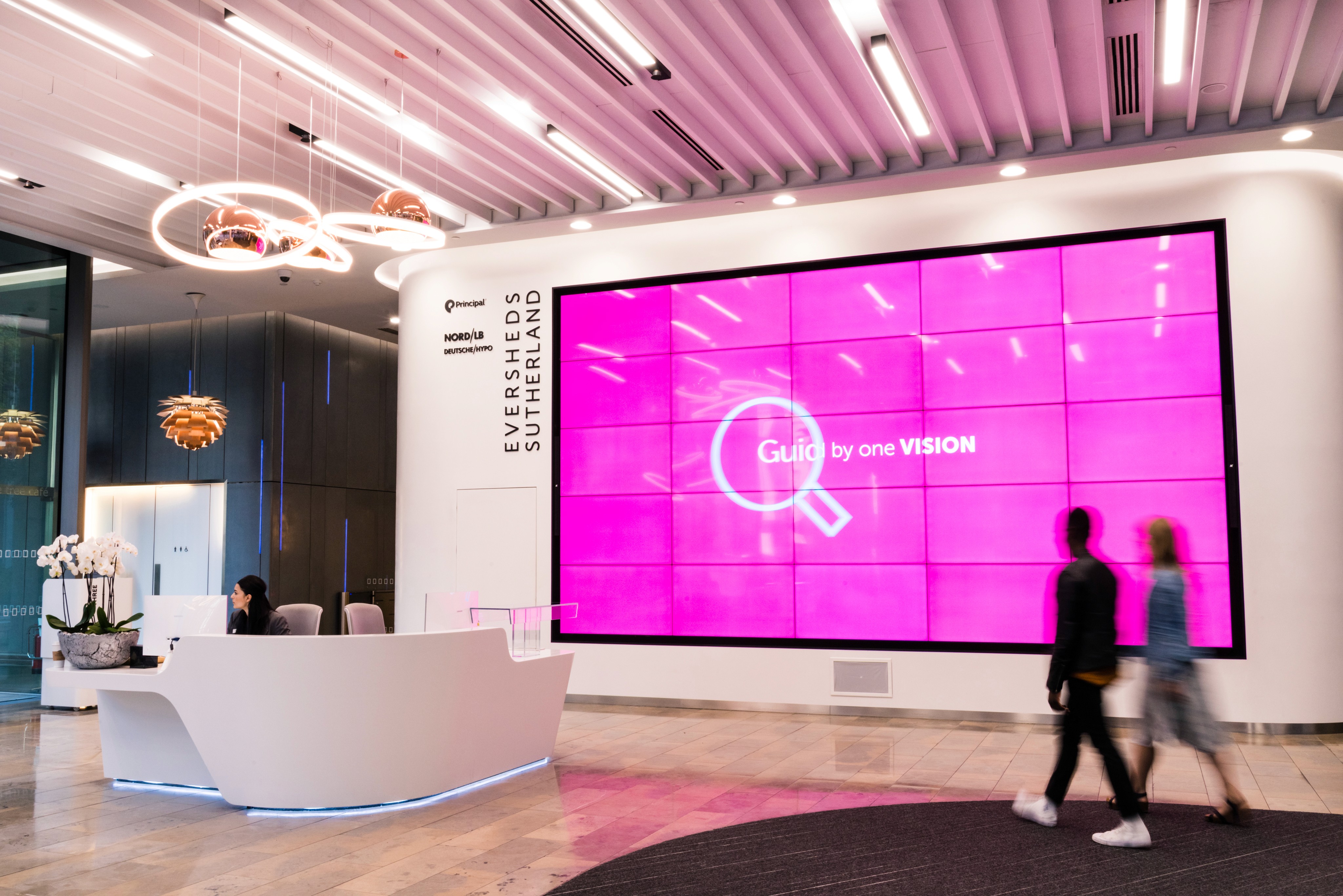 Eversheds Sutherland's reception exudes contemporary opulence. Dominating the scene is a grand twenty-five-screen television wall, complemented by a sleek, non-intrusive reception desk from Isomi.