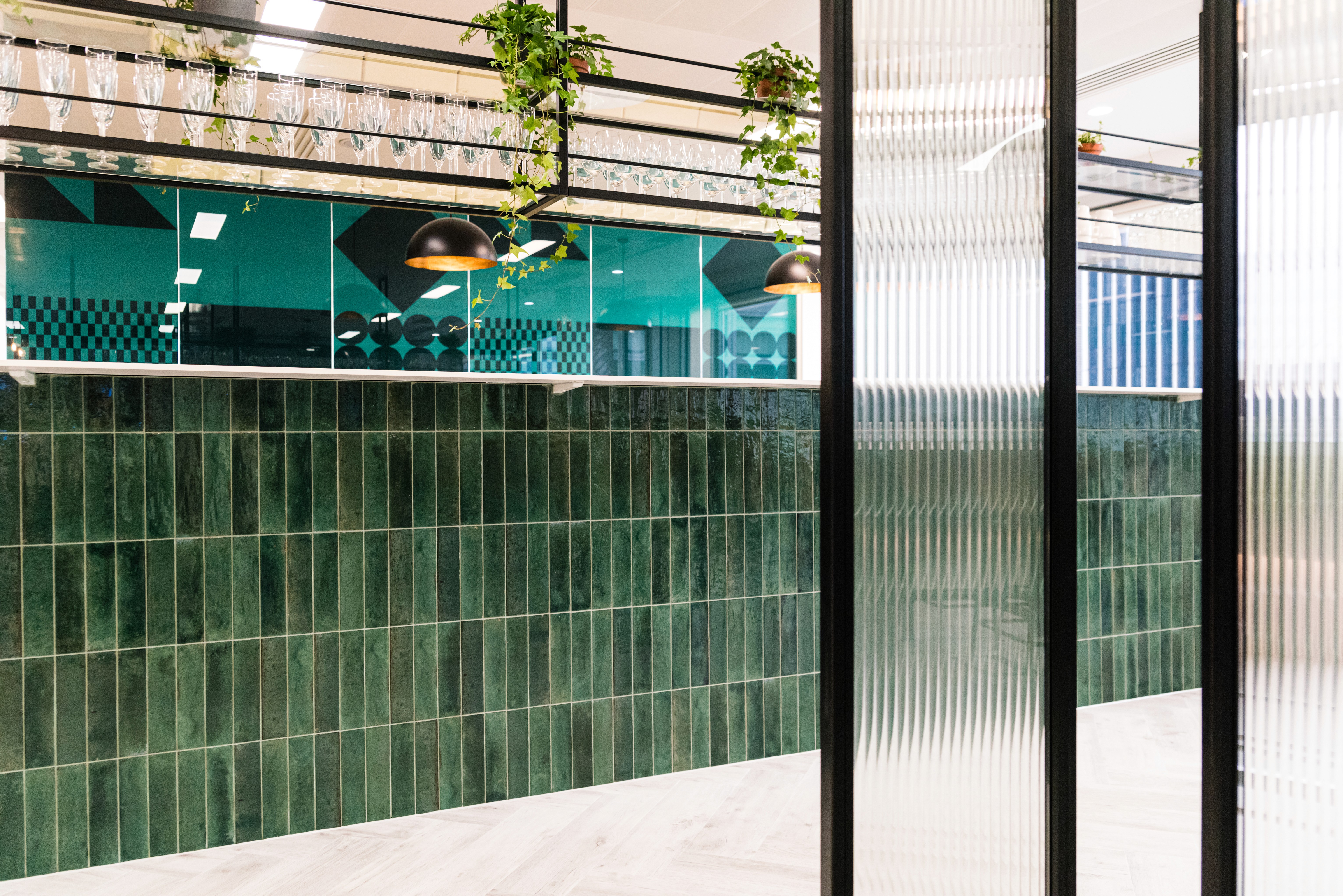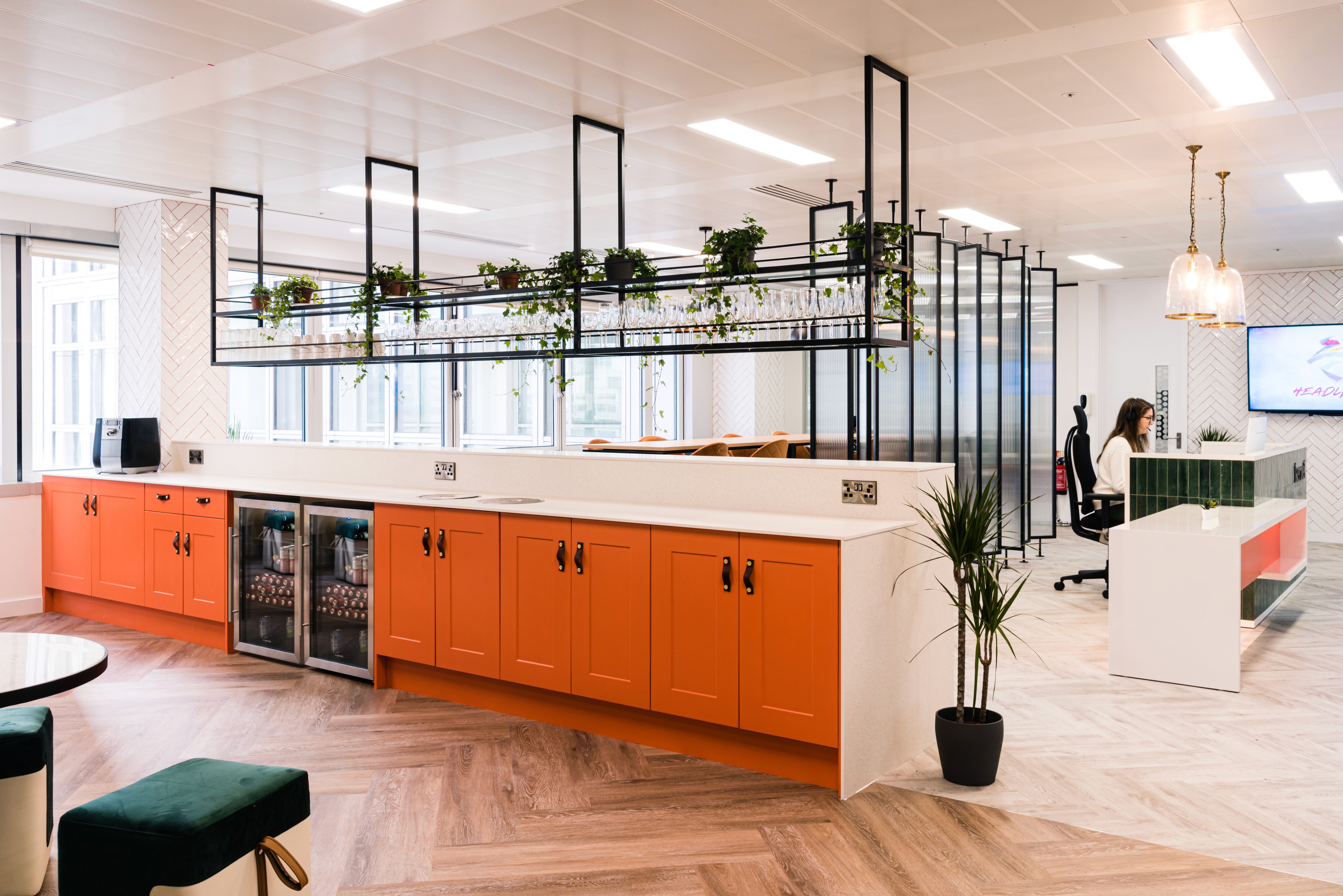 The office design has a sleek industrial look, using vibrant colors and intricate details to balance trendiness with professionalism. The reception desk, a custom creation, welcomes visitors. Behind it, rotating steel and glass panels offer a peek into the collaboration area. The kitchen stands out with hand-painted orange and green units and gold-accented mirrors and lights, imparting a luxurious residential touch.