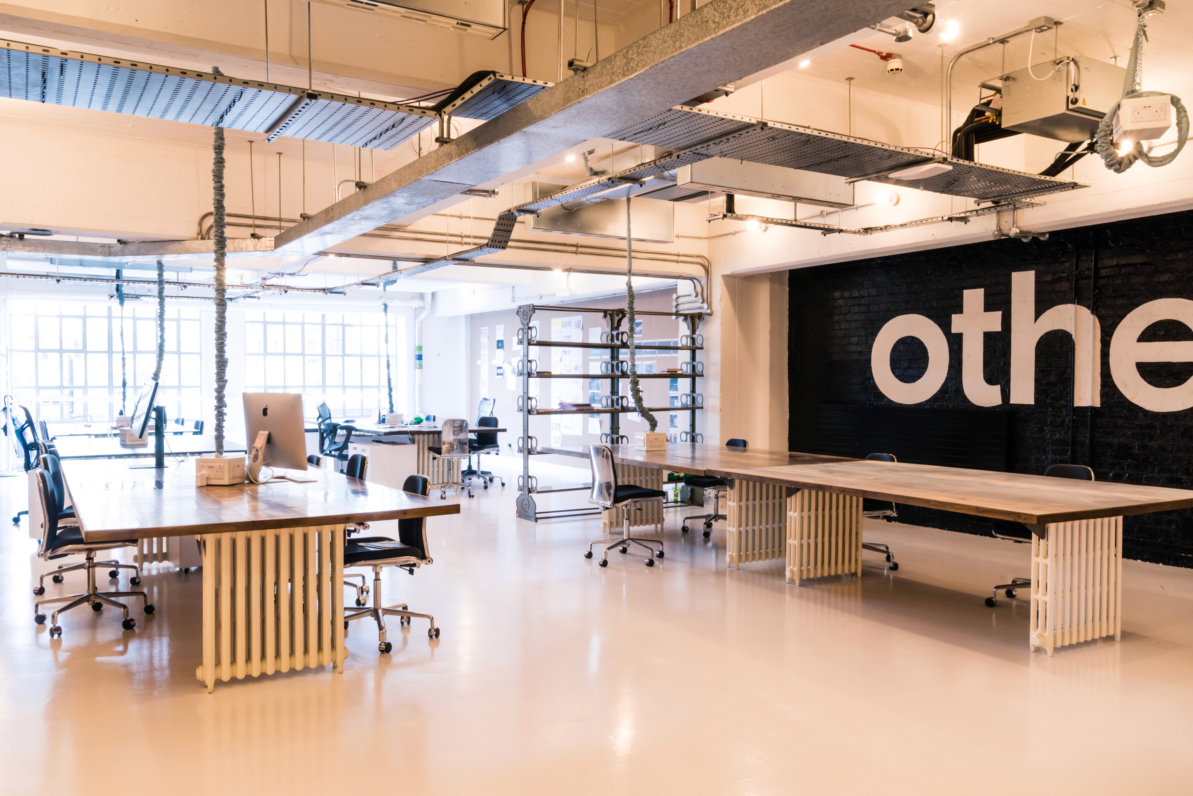 A standout feature is the massive 50-seater oval desk encircling the main columns. It's constructed from reclaimed floorboards and topped with resin. Instead of traditional workstations, we introduced custom desks, also from reclaimed floorboards and resin, but resting on vintage Victorian-style radiators.